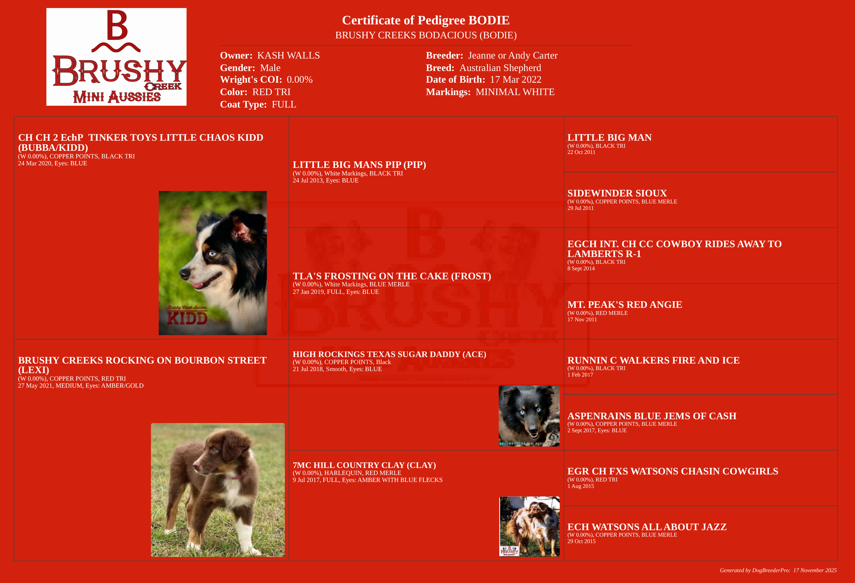 BODIE'S PEDIGREE AND INFO