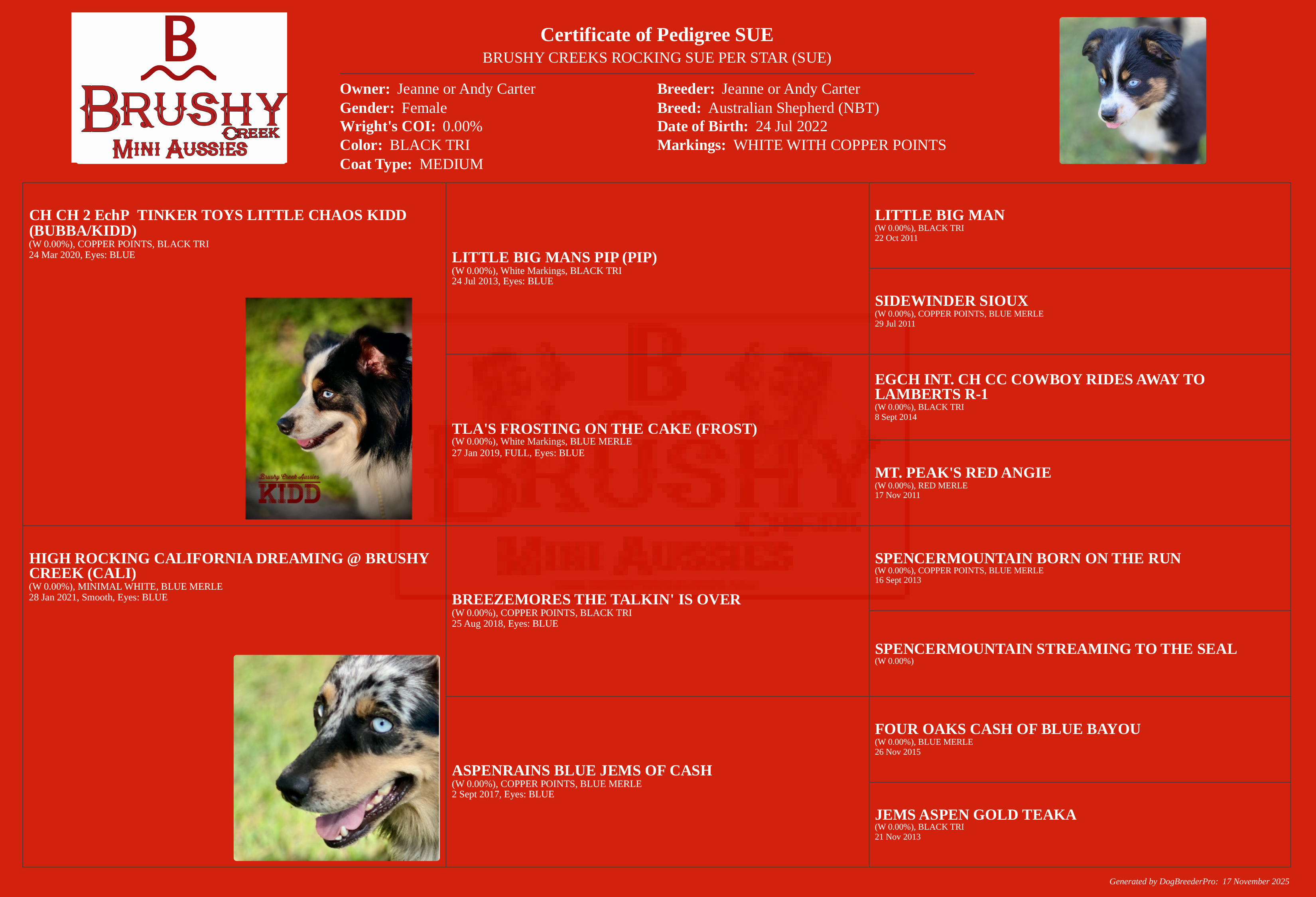 SUE'S PEDIGREE AND INFO