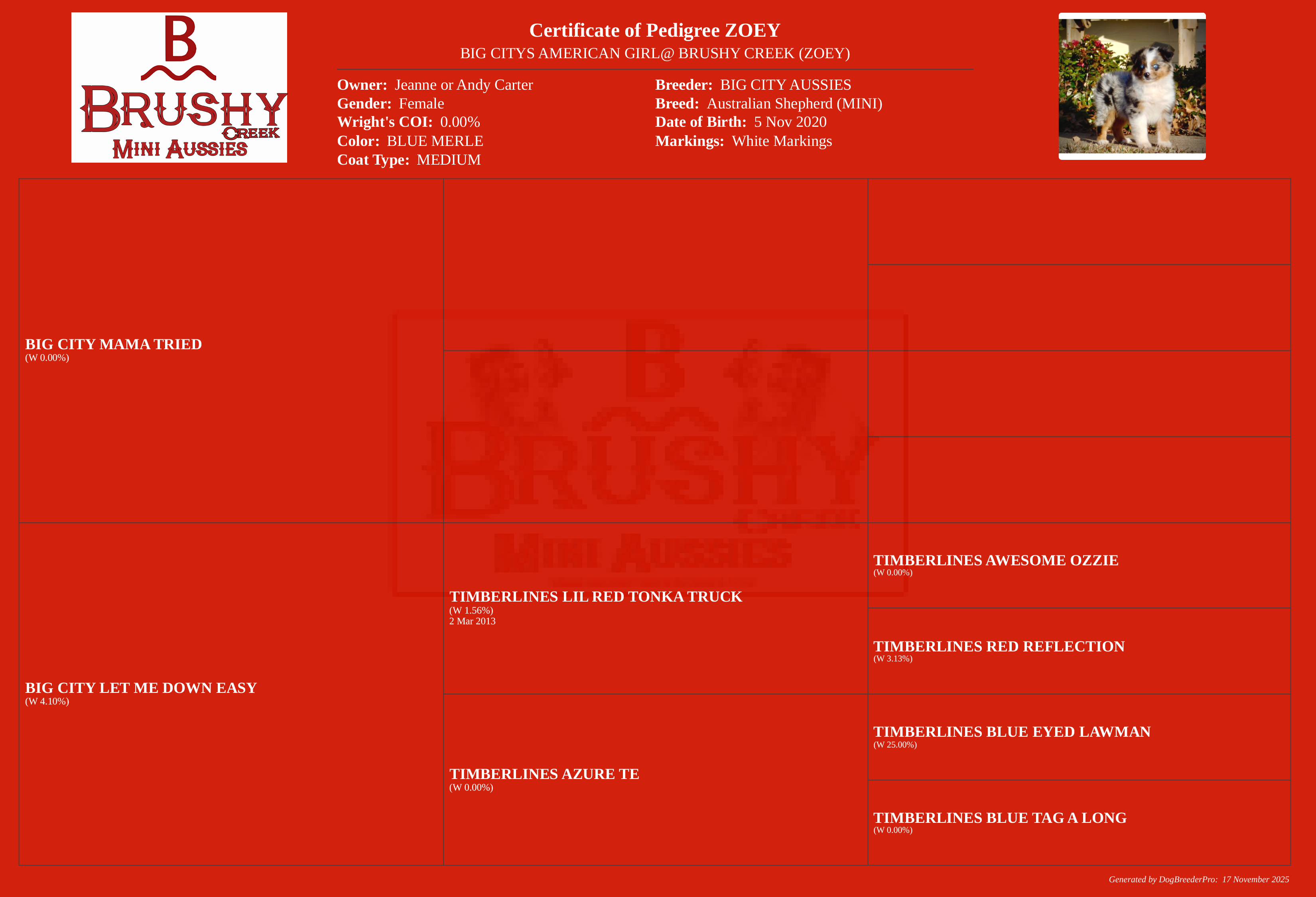 ZOEY'S PEDIGREE AND INFO